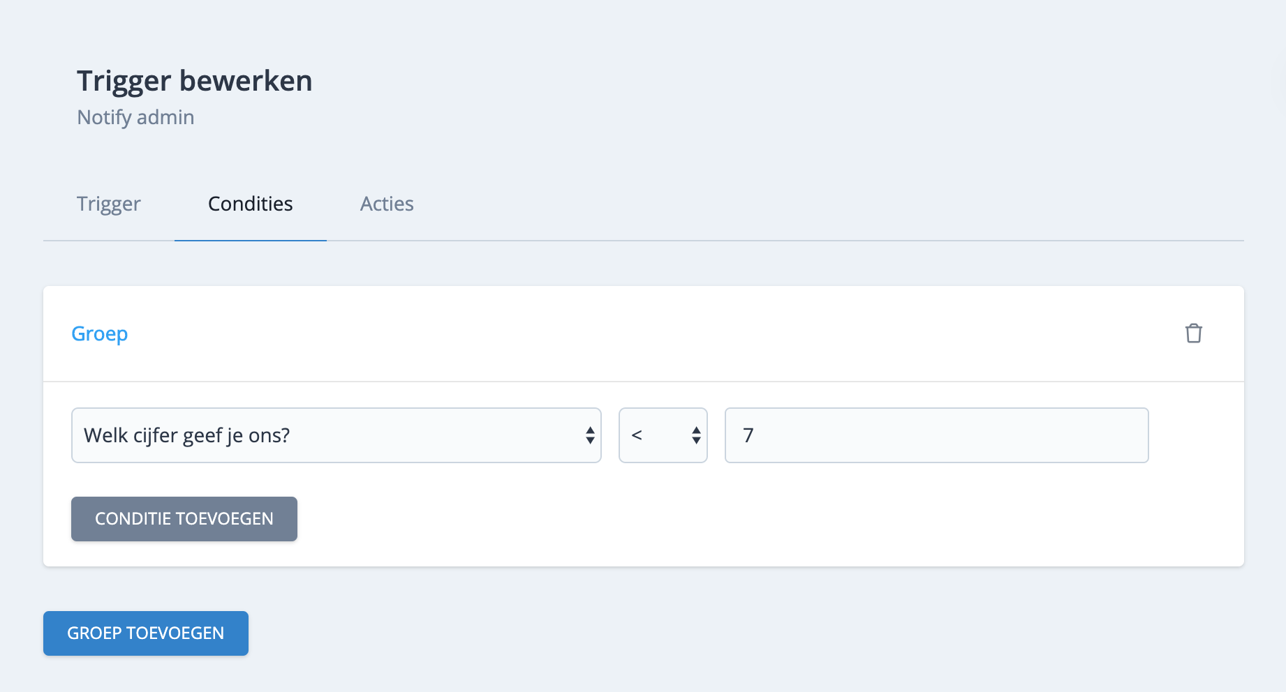 Wanneer een trigger altijd uitgevoerd moeten worden na het verzenden van het formulier dan laat je het tabblad "condities" leeg. Wanneer je wil dat de trigger uitgevoerd wordt op basis van gegeven antwoorden dan maak je condities aan. Wanneer een ingevuld formulier voldoet aan de conditie dan wordt de trigger uitgevoerd.